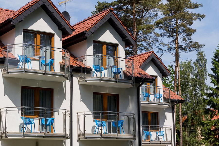 Pokoje na I i II piętrze posiadają balkony, na parterze wejście do ogrodu.