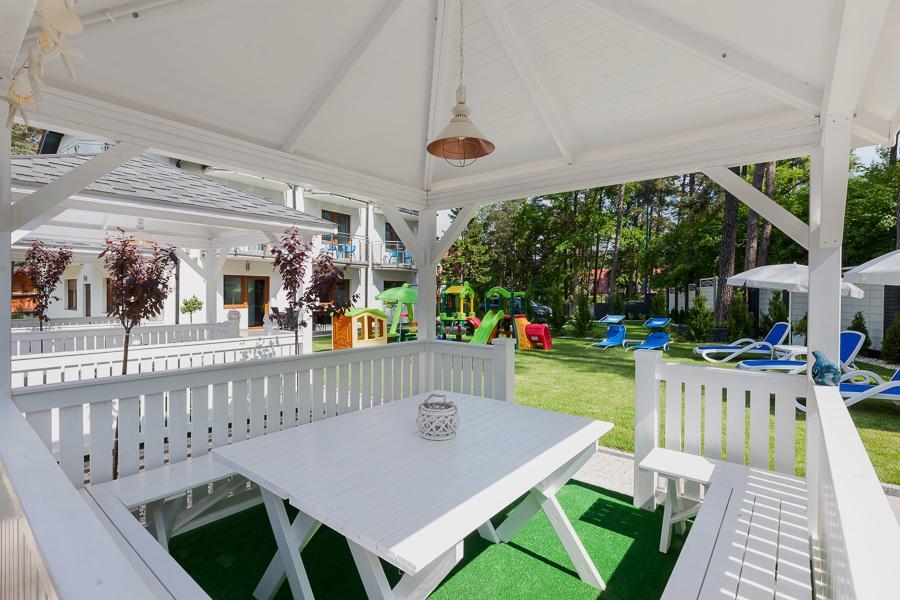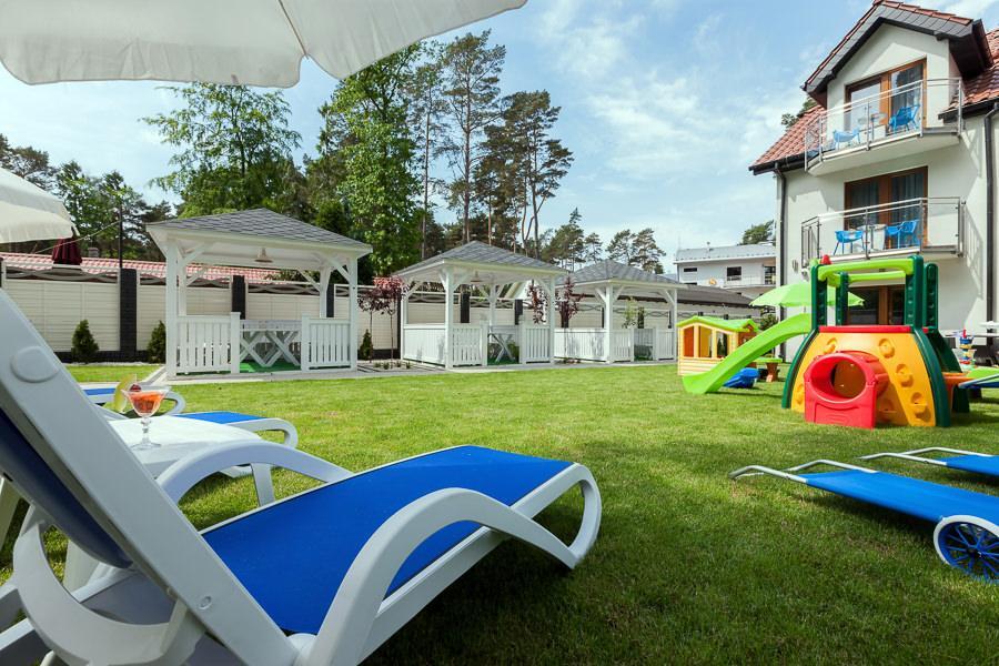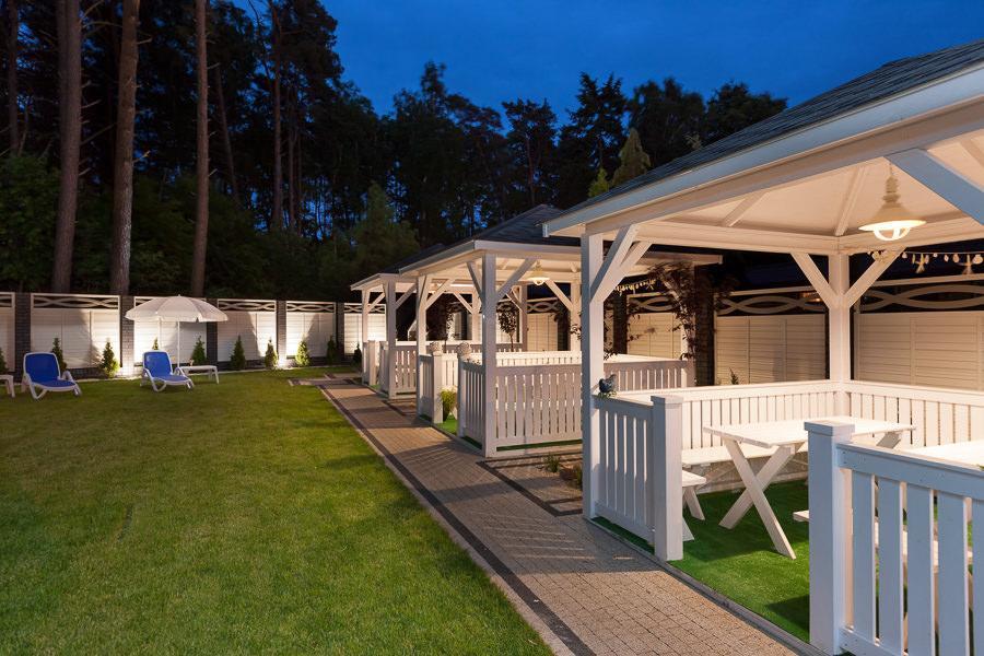 Za obiektem niezwykły ogród wyposażony w klimatyczne altany kilkuosobowe podświetlone wieczorem oraz piękne leżaki i stoliczki.