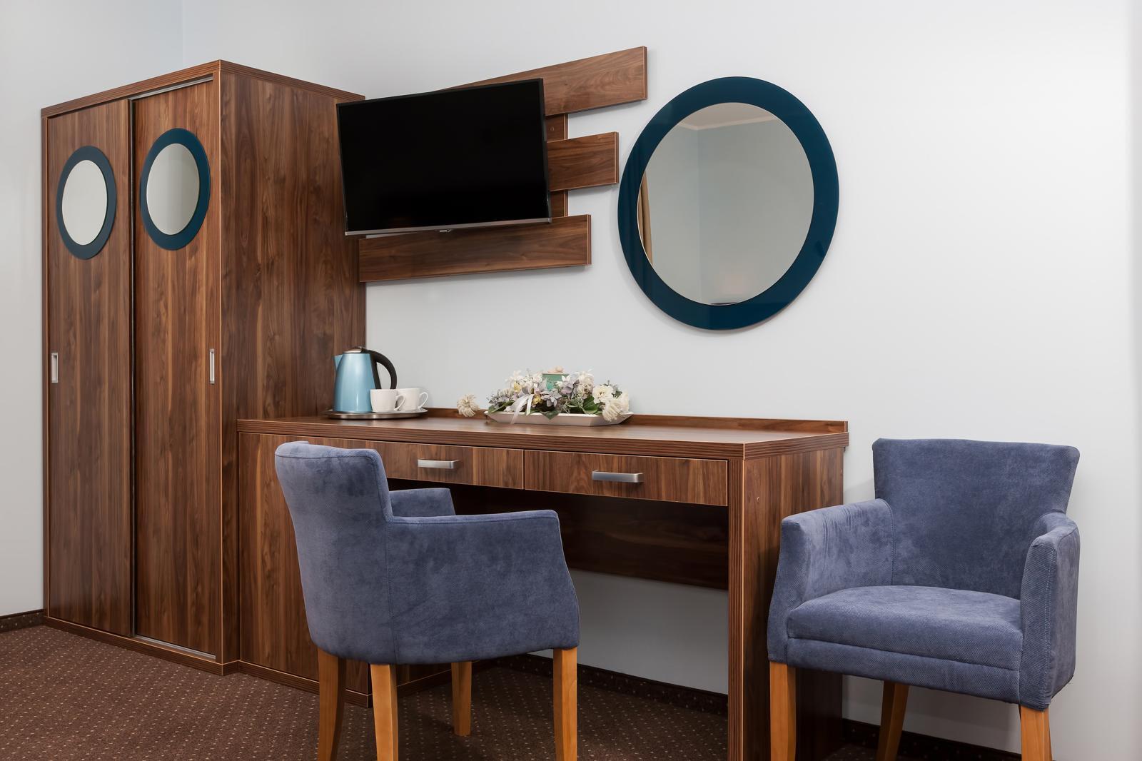 Na wyposażeniu każdego pokoju łóżka o standardzie hotelowym , funkcjonalne meble w bardzo dobrym standardzie z chłodziarką, czajnikiem , kubkami , szklankami, suszarką do włosów, są też ręczniki. Na parterze stołówka i sala zabaw.