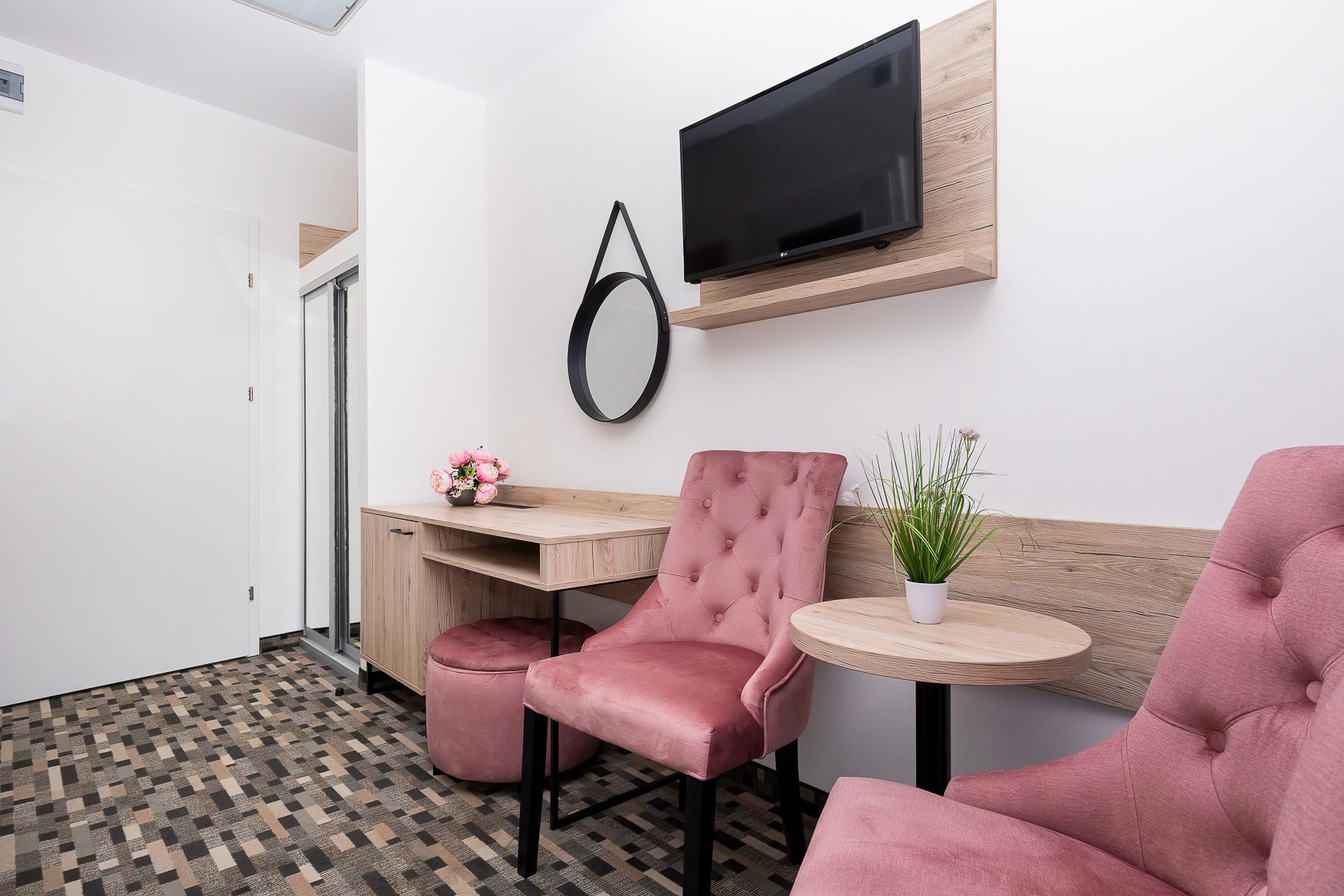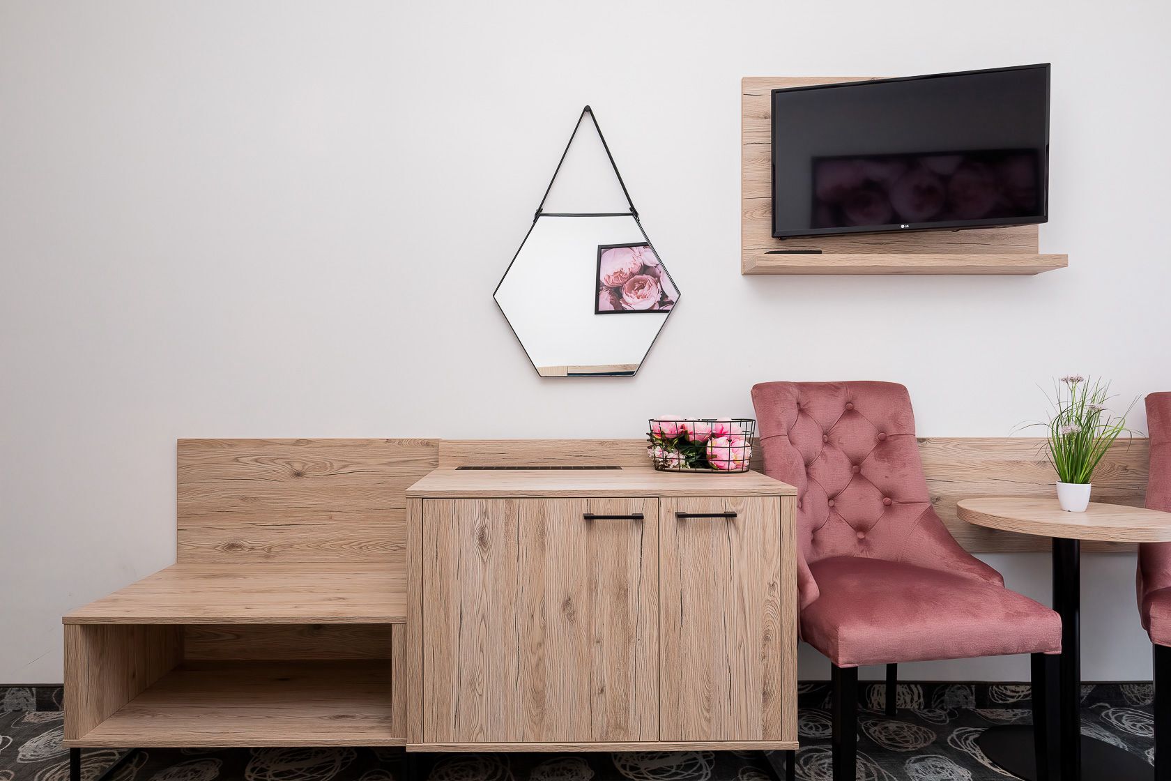 I funkcjonalne meble w bardzo dobrym standardzie z chłodziarką, czajnikiem , kubkami , szklankami, suszarką do włosów, są też ręczniki.