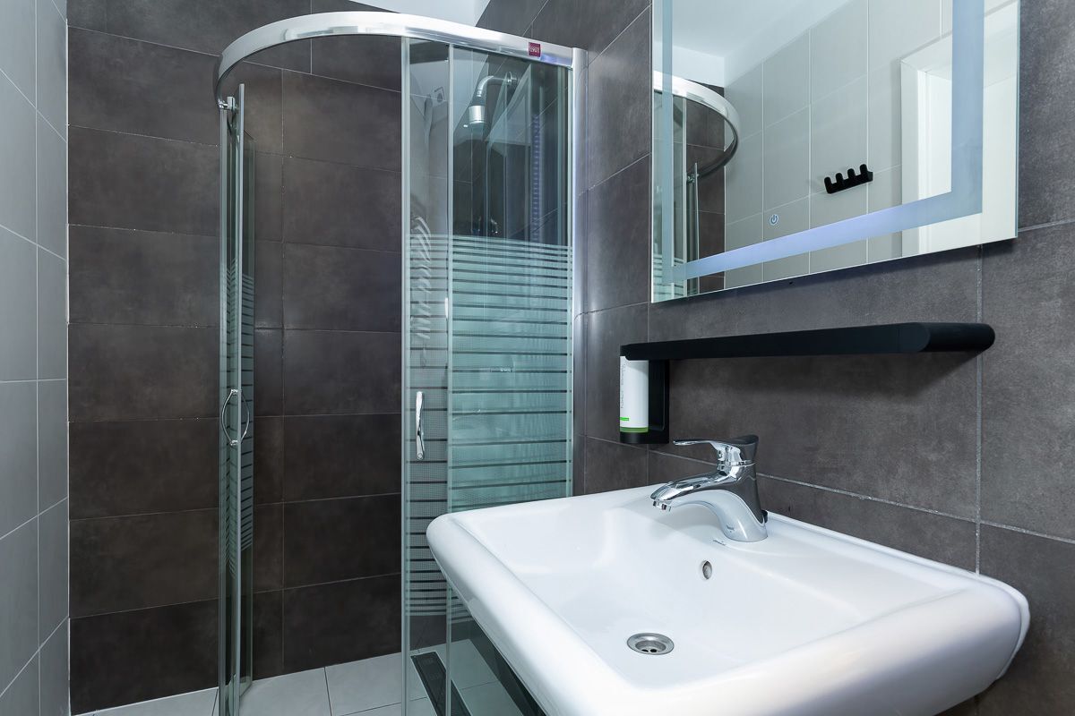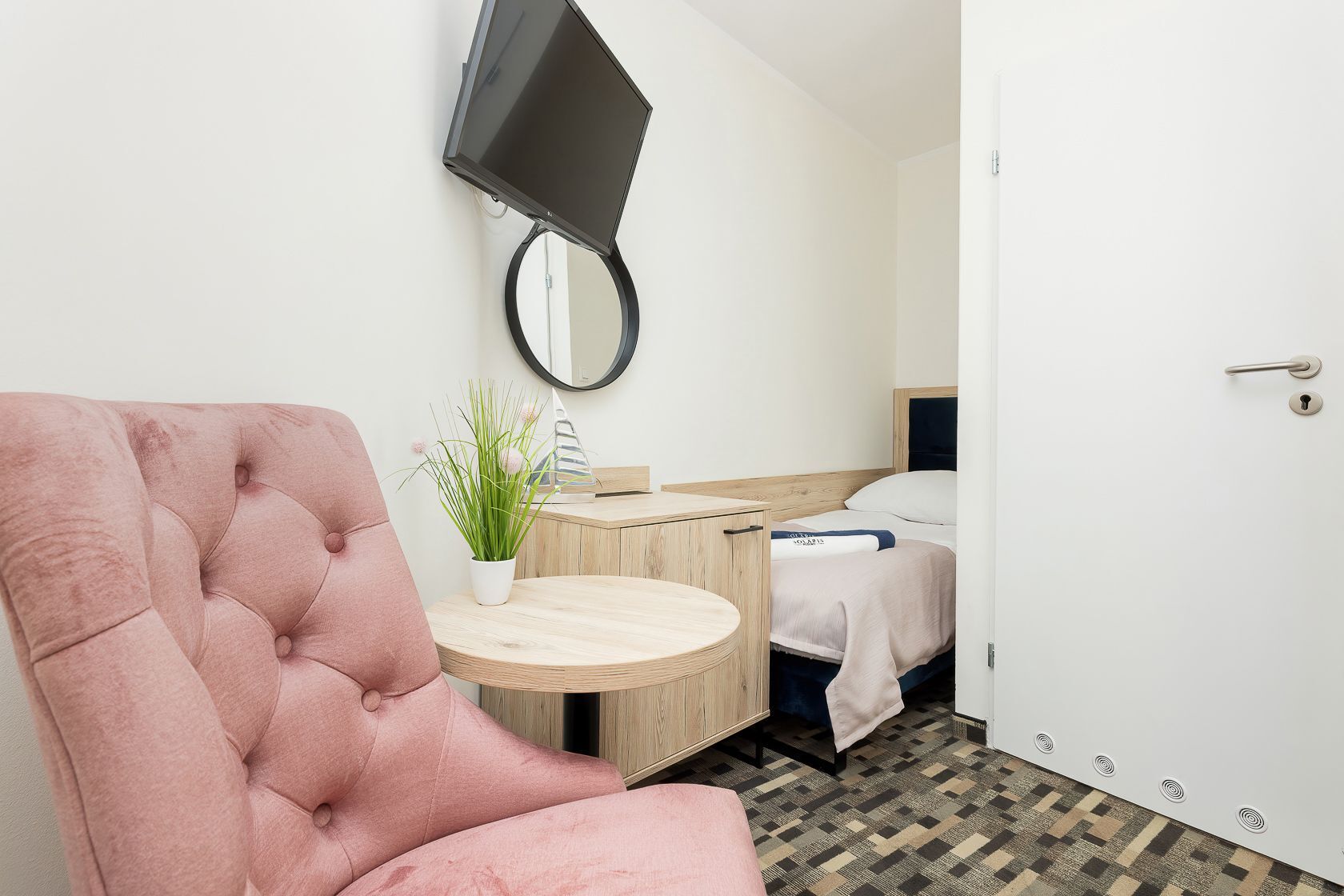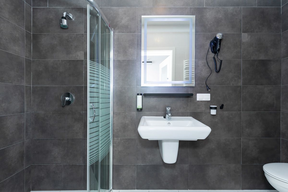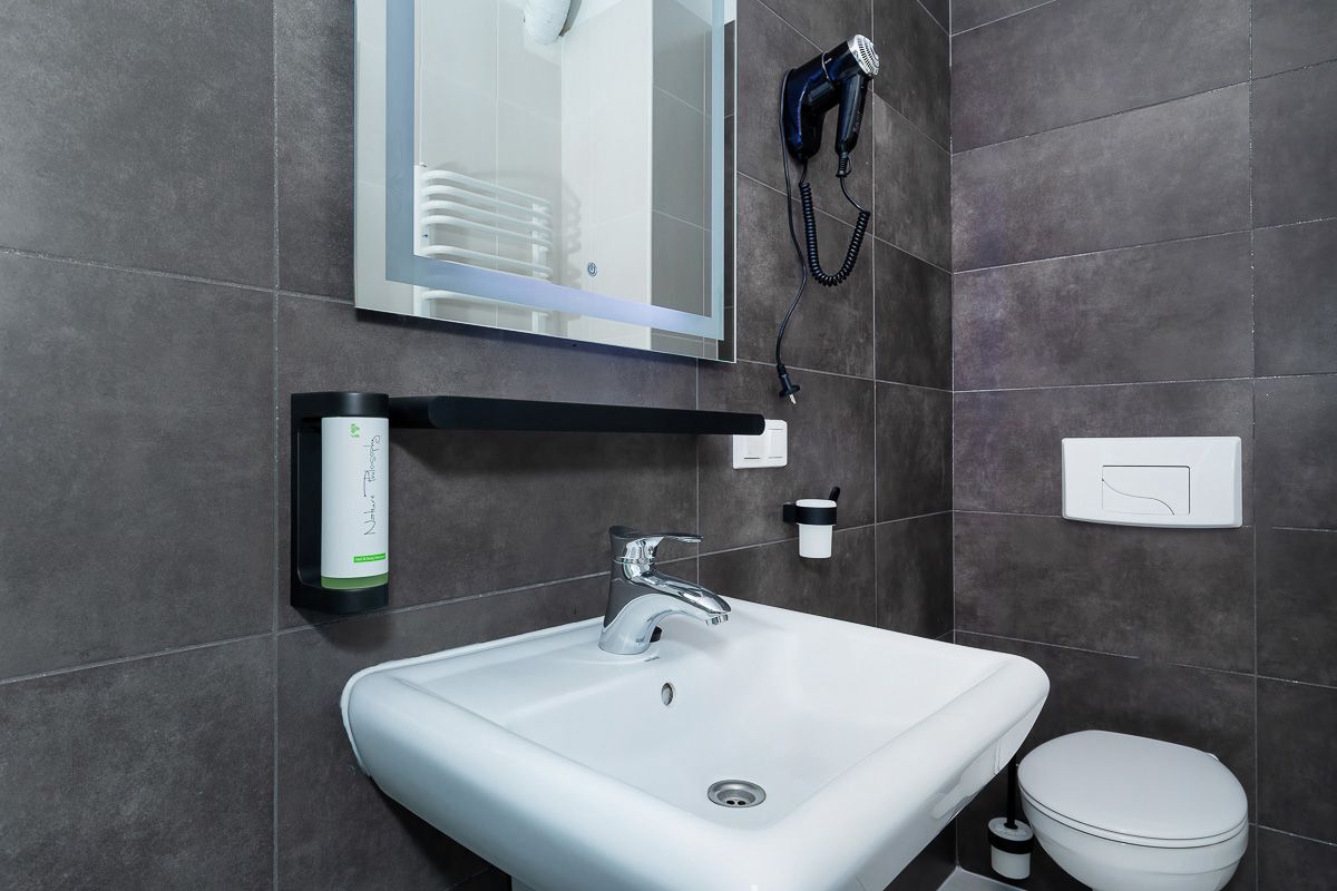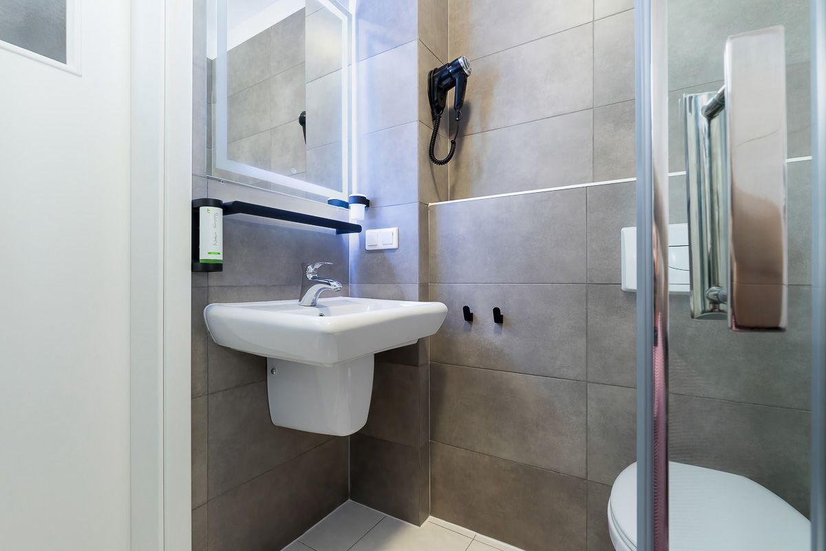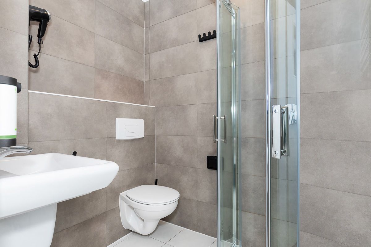 w pokojach 1, 2 osobowych i 3 osobowych z pełnym węzłem sanitarnym.